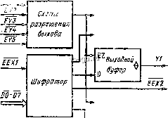 Рис 3 60 Структурная схема K-M1804BP3 Микросхема !<,М1804ВРЗ позволяет обрабатывать сигналы, поступающие от восьми схем векторного прерывания KMi804BHl, что обеспечивает 64 уровня прерывания, а также устанавливает порядок очередности их прохождения. Структурная схема КМ1804ВРЗ представлена на рис. 3,60. Расширитель приоритетного прерываипя представляет собой управляемый шифратор осуществляющий кодирование восьми входных сигналов DO-D7 в соотве!етвующий двоичный код, выдаваемый иа выходы Y0-Y2. Управление птфратором осутцсствляется сигналом ЕЕХ1, при низком уровне которого разрешается работа шифратора. На выходе ЕЕХ2 Выход расширения формируется сигнал низкого уровня при наличии сигнала низкого уровня иа входе ЕЕХ1 и отсутствии сигналов низкого уровня иа входах DO-D7. Сигнал ЕЕХ2 используется для разрешения работы схемы с низшим приоритетом при построении многоразрядных устройств обработки прерываний. Таблица 3.65
