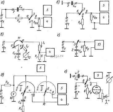 Рис. 4-22. Схема имитатора высоких значений Rw 1 - стабилизированный источник постоянного напряжения; 2 - потенциометр; 3 - вольтметр; 4 - электрометр; 5 - опорный резистор; 6 - поверяемый измеритель Соответственно изменяя величину Ui потенциометром 2, можно получить необходимое значение им- При тщательном изготовлении схемы имитатора, сведении к минимуму утечек, шунтирующих i?HM (применением в качестве, опорных изоляторов материалов с высоким Rh), можно точность имитации довести до 3-57о. Значение Ro до 10* ом измеряется с погрешностью ±0,5-±1%), Uo - с применением электрометров измеряется не хуже ±3%. Для питания схемы имитатора пригодны высо-костабилизированные источники постоянного тока, обладающие малыми пульсациями. Величина пульсации должна быть по крайней мере в десять и более раз меньше напряжения Uo, регистрируемого электрометром 4. Ж. ВРЕМЯ ИЗМЕРЕНИЯ Когда говорят о сопротивлении изоляции без указания времени, то имеют в виду Rh из выражения 4-3. Во многих случаях приводится время измерения tn. В § 4-1 подробно указывалось о временной зависимости аи и о введенных в связи с этим таких характеристик, как одноминутное Rh, десятисекундное Rh и т. п. Таким образом, вне зависимости от метода измерения, параметров измерительных установок, при определении кн(Ш) отсчет значения сопротивле-98 НИЯ изоляции должен быть выполнен через ц=60 сек после подачи на испытуемый конденсатор зарядного напряжения. Составными частями этого времени являются: ts - время в течение которого конденсатор заряжается до напряжения источника, ti (см. § 4-2, п. Б) либо t (см. § 4-3) и т. д. Естественно, во всех случаях необходимо выбирать параметры входных цепей измерителей так, чтобы ti (4-23), (4-24) было бы меньше /и- В § 4-2 было показано, что при больших значениях Си и малых in осуществление ti<tn связано с большими трудностями. Важно заметить, что достижение этого неравенства облегчается приме- нением методики, изложенной в § 4-5, п. А. В ряде случаев разбраковку конденсаторов по R и можно производить при t<tn. Если значение i?H(iM) конденсаторов во много раз больше нормы, т. е. /?и(Ш)-/?и. д, то при технологической отбраковке конденсаторов, имеющих пониженное значение Rn, нет нужды выжидать полностью 4i=60 сек (см. § 4-5, п. Г). 4-6. Измерение коэффициента абсорбции Измерение коэффициента абсорбции и исследование абсорбционных кривых приобретает с каждым годом все большую важность для оценки качества изоляционных материалов [1-27, 1-32, 4-6, 4-41, 4-43, 4-60, 4-76]. Коэффициент абсорбции является важной характеристикой конденсатора, определяющей его пригодность для использования в различных специальных* схемах радиоэлектроники [4-54]. По величине коэффициента абсорбции определяют также степень увлажнения и загрязненности изоляции трансформаторов и электрических машин [1-17]. Сильное увлажнение изоляции, особенно ее внутренних слоев, вызывает резкое снижение тока абсорбции и значительное увеличение тока утечки [5 68а]. Как известно [1-26, 1-27, 4-61, 4-99], величина абсорбции обычно оценивается коэффициентом кц, численно равным отношению напряжения остаточного заряда AU к зарядному напряжению и. При средних и больших коэффициентах абсорбции (а>10%) имеется возможность непосредственно определить величину абсорбционной емкости Са. Для этого производят измерение емкости испытуемого конденсатора методом заряда [2-6, 2-40], затем находят его емкость на л