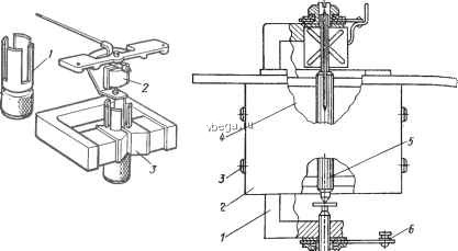 Примечание, в приборах, указанных в таблице, используются подпятники типа ПАК 1,5X0,20. Уравновешивание подвижной системы измерительного механизма. Уравновешивание подвижной системы милливольтметров и логометров выполняют путем перемещения балансных грузиков по резьбе балансных стержней с тем, чтобы добиться совмещения центра тяжести системы с ее осью вращения. Подвижные системы милливольтметров, шкалы которых начинаются с нуля, уравновешиваются обесточенными. Под. вижные системы милливольтметров, шкалы которых начинаются не с нуля, а также логометров уравновешиваются под током. Обычно балансировку приборов осуществляют в следующем порядке. Корректором устанавливают стрелку прибора на начальную отметку. Прибор размещают так, чтобы ось рамки была расположена горизонтально и грузики находились ниже стрелки. Определив преобладающий момент вращения, перемещением грузиков, добиваются установки стрелки на начальную отметку шкалы. Перемещая грузики, устанавливают равновесие подвижной системы при наклоне прибора в четырех направлениях. При уравновешивании перемещение грузиков вьшолняют специальным ключом или горячим паяльником. По окончании уравновешивания грузики закрепляют шеллаком. Магнитные системы измерительных механизмов. Постоянный магнит совместно с полюсными наконечниками и цилиндрическим сердечником образует магнитную систему прибора и служит для создания магнитного потока. С течением времени вследствие старения магнитные системы теряют свои свойства. Причинами частичной потери магнитных свойств являются физико-химические изменения структуры материала, измене ние температуры, действие внешних магнитных полей и вибрации, удары, При ремонте приборов измерительный механизм подлежит разборке в результате чего магнитная энергия магнита ослабевает, так как в при борах с внутрирамочным магнитом происходит полный разрыв магнит ного потока, в приборах с внешним магнитом - значительное увеличение воздушного зазора. Поэтому после ремонта магнитной системы необходимо измерить магнитную индукцию в воздушном зазоре и в случае необходимости произвести намагничивание и магнитное старение. Намагничивание магнитной системы приборов вьшолняют на специальных установках (рис. 74). Магнит или магнитную систему с учетом полярности помещают в зазоре мевду полюсньими наконечниками 7 и 2 и пропускайт по катушке электромагнита 3 постоянный ток. Зазор между полюсами электромагнита можно изменять путем перемещения полюса с помощью рукоятки 4. Намагничивание происходит в доли секунды. Чтобы после намагничивания не прерывать магнитной цепи, целесообразно производить намагничивание не отдельного магнита, а измерительного механизма в сборе. При намагничивании измерительного механизма необходимо, чтобы обмотка рамки была разомкнута, а подвижную систему нужно предохранять от ударов закладыванием деревянных клиньев в зазор между магнитом и магнитопроводом. Магнитные системы намагничивают до полного насыщения, то определяют по значению магнитной индукции в воздушном зазоре. 116