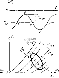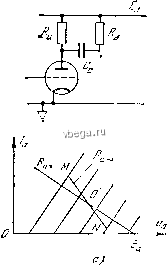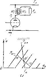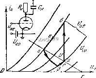Космонавтика Электронные усилители Рассмотрим условия получения максимальной мощности переменных составляющих. Для этого выразим ее следуюашм образом: р ~Ln п или, используя формулу (2.8), напишем: Р. Э ( V-Jт вх (2.12) (2.13) При заданной амплитуде входного напряжения для получения максимальной мощности со- ц, противление нагрузки необходимо сделать равным сопротивлению источника. Действительно, при R= полученное выражение имеет максимум. При этом условии достигается максимальная мощность на выходе при заданной, фиксированной ве- личине (7 Более важно определить условие получения максимально возможной мощности Р при заданной начальной мощности рассеяния на аноде Р. . Будем увеличивать сопротив- ление вращая линию нагрузки вокруг точки (У. При этом потребуется увеличивать напряжение а также амплитуду /7 вх, чтобы полно- е стью использовать область характеристик, ограниченную Р <- З-- Временная диаграмма уси- ией на рис. 2.4 и характеристикой и = 0. Из треугольника аЬс имеем уравнения 2тя а мин макс> а макс откуда / = аа - ° -амии < t (2.14) где числитель дроби заменен одной буквой U. Подставим значение в формулу (2.12): - = 4(2J - (2.15) Дифференцированием по находим, что максимальная мощность получается при условии R = 2R-. Временные диаграммы. Постоянные и переменные составляющие показаны на временной диаграмме рис. 2.5, где изображены временные зависимости потенциалов и, и тока для случая синусоидального входного напряжения. Эти диаграммы удобны для наглядного изучения формы потенциалов и токов. § 2.2. Работа анодной цепи со сложной нагрузкой В практических схемах усилителей анодная нагрузка почти всегда представляет собой сложную цепь, содержащую как активные, так и реактивные сопротивления. Поэтому очень часто сопротивления ![]() ![]() Рис. 2.6. Динамические линии нагрузки: а) Ra~.<Ra= )а~>а=- анодной нагрузки постоянному и переменному току оказываются различными, а фазы переменных составляющих потенциалов анода, сетки и анодного тока не совпадают во времени. Динамическая линия нагрузки. Пусть емкость конденсатора (рис. 2.6, а) настолько велика, что сопротивление его в рабочем дна- пазоне частот можно считать равным нулю. В этом случае сопротивления /?д и /? оказываются соединенными параллельно. Следовательно, сопротивление анодной нагрузки переменному току получается меньше сопротивления постоянному току Ra= - Ra> поэтому динамическая линия нагрузки MN для переменных составляющих наклонена под большим углом. Линия ЖА является траекторией рабочей точки (Ид). Если в анодную цепь включен трансформатор с сопротивлением нагрузки R, то в диапазоне достаточно высоких частот имеем /?a- = rj-}-i?a=. Сопротивление анодной нагрузки постоянному току в этом случае может быть очень малым, оно равно сопротивлению r первичной обмотки трансформатора. Динамическая линия нагрузки MN наклонена под меньшим углом, чем линия Ra=. Переменные составляющие при комплексной нагрузке. До сих пор мы рассматривали переменные составляющие в предположении. ![]() ![]() а/ б) Рис. 2.7. Траектории рабочей точки при комплексной нагрузке емкостного характера: О) входное иапряженне в виде импульса, б) входное напряжение синусоидальное. ЧТО сопротивление анодной нагрузки чисто активное. На практике, однако, нередки и важны случаи, когда в сопротивлении нагрузки содержится реактивная составляющая, чаще всего емкостная. При