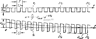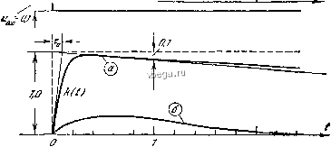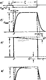 Космонавтика Электронные усилители Если R<4Re и С <С то Тд<т< 5 я 1, 6, да 1/t , Ь, да b - &j l/Ta И вместо (3.38) можно написать: j t k{t)=e~ 0 -е -t . (3.39) Вначале, когда время t одного порядка с т и t<x, можно полагать, что k(t) = \-e~ Когда время t одного порядка с т, k(t) = e~ Переходная характеристика каскада представлена на рис. 3.7. La i ![]() 2 м/fce Рис. 3, 7. Переходная характеристика одиокаскадного усилителя. Кривая й рассчитана при T = 0,1 мксек, т=10 мксек; кривая б - при т = т=т=1 мксек. Последнему случаю, когда Тд = т, соответствуют частотные характеристики, изображенные на рис. 3.3 пунктирными линиями. Разница заключается лишь в величинах постоянных времени т. Передача П-образного импульса. Импульсы этой формы или близкой к ней часто встречаются на практике. На рис. 3.8 изображены импульсы, фронт и вершина которых искажены каскадом. Выходной импульс представляет собой результат сложения двух импульсов в форме ступени - положительного и отрицательного, который сдвинут на время Г . Соотношения между параметрами каскада и длительностью импульса 7 приняты следующие: т = 0,1 Г , т =10 Г . Тс : ![]() ВМХ X (3.40) Рис. 3.8. Передача П-импульса однокаскадным усилителем. Последнее приближенное равенство справедливо при Т<с- Величина относительного выброса Ь равна выбр (3.41) Передача серии импульсов. Искажение фронтов в серии импульсов ничем не отличается от искажений одиночного фронта. Искажения вершины имеют особенности. Из-за того, что через конденсатор t- не может проходить постоянная составляющая тока, потенциал правой обкладки конденсатора вследствие его перезарядок изменяется так, что 8 среднем во времени становится равным нулю. При этом На рис. 8.8, в и 3.8, г заметен выброс напряжения. Он получился из-за изменения разности потенциалов на конденсаторе за время 7 . Величина выброса и J. ![]() Рис. 3.9. Передача серии импульсов однокаскадным усилителем. когда постоянная составляющая выходного напряжения уменьшилась до нуля, площадь, расположенная выше нулевой линии, равна площади импульса, расположенной ниже нулевой линии. Пьедестал импульса, т. е. уровень по- -т--- тенциала, от которого от-считывается высота импульса, понижается. Оценка параметров ламп. Чтобы оценить возможности лампы при усилении импульсов, прежде всего необходимо разрешить следующий вопрос: сколько времени требуется, чтобы потенциал анода лампы изменился на величину, равную изменению потенциала сетки, если анодная цепь лампы нагружена лишь емкостью лампы С которая равна сумме выходной емкости данной лампы и входной емкости следующей лампы. Пусть сопротивлениев схеме рис. 3.10 бесконечно велико. Очевидно, что Рис. 3.10. К оценке параметров ламп. 4 л + СВ Выходной ток время равно При условии Аа искомое (3.42) средний во времени ток через сопротивление также становится равным нулю и в дальнейшем (при tx) средняя разность потенциалов на обкладках больше не изменяется. Процесс передачи серии импульсов изображен на рис. 3.9. В установившемся режиме,
