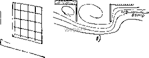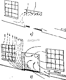 в графе 3 - величина q = -J-. н в графе 7 - величина опре- ![]() деленная на основе опытных данных. В графе 8 даны найденные по теоретической формуле (9) значения р для величии q. Теоретическая кривая по формуле (9) и опытные точки нанесены на рис. 22. Как видно из табл. 2 и рис. 22, опытные точки хорошо совпадают с теоретической кривой и в случае действия ветра. Таким образом, теоретический вывод, сделанный для случая действия ветра, можно считать подтвержденным. Вывод справедлив не только при направлении ветра, перпендикулярном к плоскости ворот, но и при любом другом его направлении. Для учета влияния ветра иа количество воздуха, проходящего через ворота при любом его направлении, необходимо только знать аэродинамические коэффициенты для здания, к воротам которого проектируется воздушная завеса. о 0.2 O.i 0.S q Рнс. 22, Теоретическая кривая \1. = f (q) для односторонней завесы с опытными точками экспериментов В. В. Батурина при действии ветра ![]() ![]() Рис. 23. Влияние на течение струй воздушной завесы ветра, дующего вдоль фасада здания: а - течение воздуха завесы при отоут-ствлн ветра; б - течение поядуха завесы nf i ветре вдоль фасада здааня; в - cse-ыа защиты завесы от ветра вдоль фасада здання Рассмотрим случаи, когда ветер направлен вдоль стены, в которой устроены ворота. Как известно, при таком направлении ветра аэродинамические коэффициенты близки к нулю. Следовательно, количество 30 воздуха, проходящего через ворота при ветре, будет почти такое же, как при безветрии. Однако, если при отсутствии ветра Б ворота будет входить в основном теплый воздух, подаваемый Б завесу (рис. 23, а), то при продольном ветре теплый воздух завесы может быть снесен в бок по фасаду здания, и в ворота будет входить холодный наружный воздух (рис. 23,6). Во избе-жлине такого явления рекомендуется устраивать .наружные тамбуры. Даже установленные перпендикулярно фасаду плоскости открываемых наружу распашных ворот (рис. 23, в) дают возможность в значительной мере предотвратить снос ветром теплого воздуха завесы в сторону от ворот. В тех случаях, когда нет защиты от ветра,.дующего вдоль фасада здания, не следует делать завесы с большими углами выпуска воздуха по отношению к плоскости ворот (угол а). Чем больше угол а, тем больше струя завесы будет выходить наружу и тем больше возможность сноса ее в бок от ворот. Поэтому для ворот, не защищенных тамбуром, рекомендуется применять угол а = 30°. В случае устройства наружных тамбуров угол а может быть принят 45°. При устройстве завес в коридорах, туннелях, каналах угол а может быть принят 60° и больше (до ЭО).